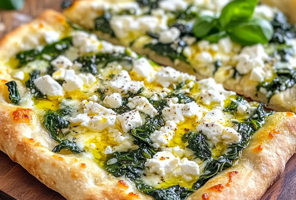 Transform your kitchen into a Greek taverna with this irresistible white pizza that marries sweet roasted garlic with vibrant spinach and creamy Mediterranean cheeses.